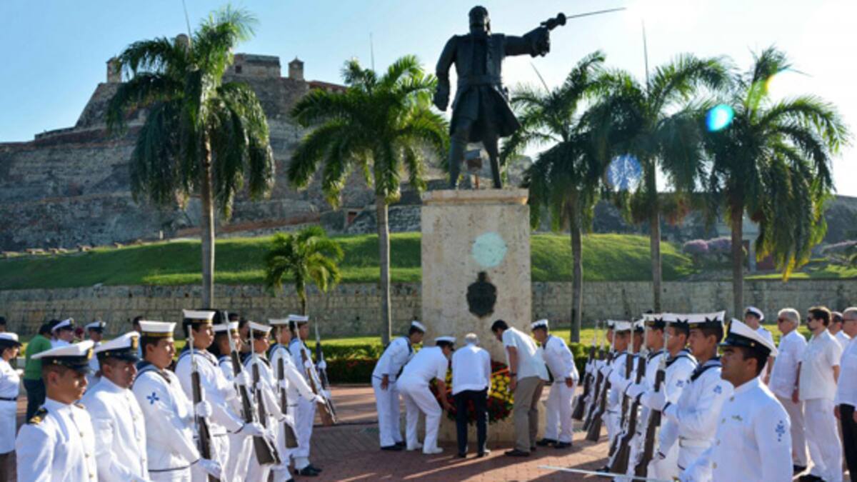 A las 7:45 de la mañana el Ministro, el embajador de España en Colombia, Ramón Gandarias; el cónsul de España en Cartagena, Santiago Salas Collante; directivos de la Cooperación Española, acompañados del alcalde Dionisio Vélez y su secretario General, le colocaron una ofrenda floral al monumento del marino tuerto, manco y cojo (conocido en sus tiempos como 'medio hombre') que sacó de tierras y aguas cartageneras a los ingleses, que, en aquellas épocas, daban por descontada la victoria del almirante Vernon y por consiguiente la toma de este puerto para el imperio británico.