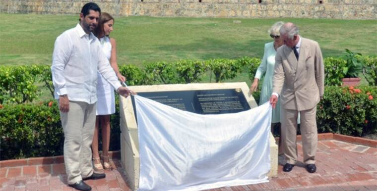 Dionisio Vélez, alcalde de Cartagena; María Victoria Donado, primera dama, y sus altezas reales develan la placa el pasado 31 de octubre./ Foto: Javier García