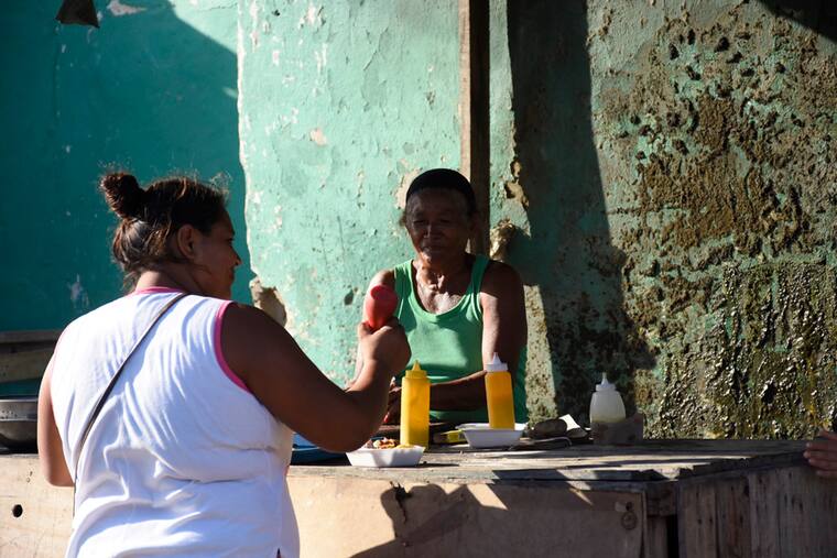 Mientras cuenta billetes, un pequeño de cinco años le insiste en que lo deje jugar, tres niñas le piden cartones, otros dos plastilina, y el olor a cerdo, chichurria y cuajo asado se le mete por la nariz.