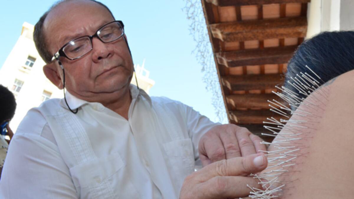 Desde las 8:30 de la mañana, en la plaza de la Aduana, bajo la supervisión del médico acupunturista Fredy Hernández, empezó esta particular protesta que llamó la atención de cientos de turistas que llegaron a observar la manera en la que el doctor insertaba una a una las agujas.