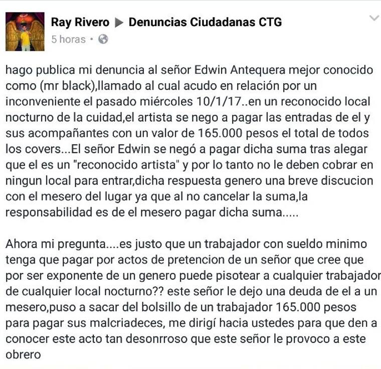 En la publicación, que rápidamente recibió cientos de comentarios, un hombre identificado como Ray Rivero señala que el intérprete de ‘El Serrucho’ llegó el pasado miércoles a una discoteca del Centro de Cartagena y se negó a pegar el valor de las entradas de él y de sus acompañantes, lo que le acarreó una deuda a uno de los meseros del lugar.