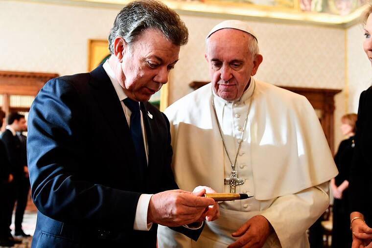 Santos entregó a Francisco dos regalos, un balígrafo con la inscripción 'Las balas escribieron nuestro pasado. La paz, nuestro futuro', y una corona de orquídeas de porcelana, esculpida por una artista colombiana.