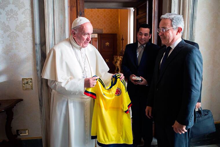 El regalo de Uribe fue una camiseta de la selección Colombia, apelando a la afición futbolera del jerarca católico.