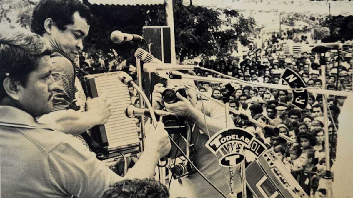 Una imagen infaltable de Alfredo en todos sus conciertos: levantado en hombros y ejecutando el acordeón acompañado con los pies.