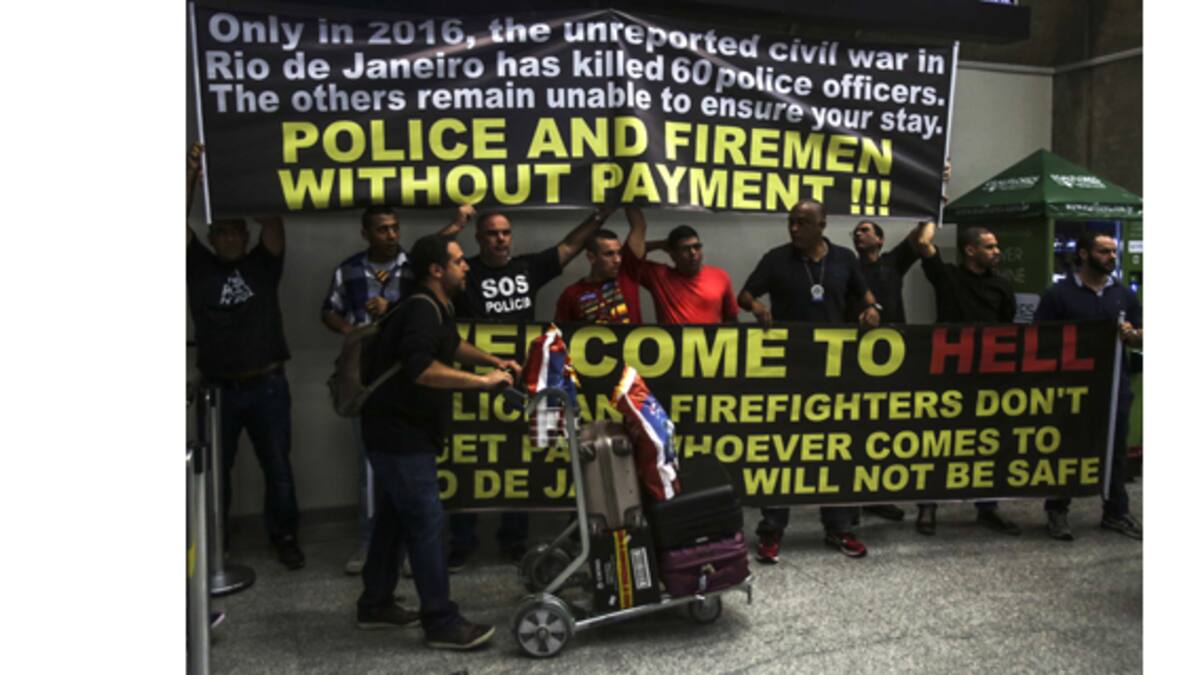 'Bienvenidos al infierno', rezaban las pancartas que policías y bomberos exhibieron ayer en el aeropuerto internacional de Río de Janeiro para denunciar la precariedad de sus condiciones de trabajo a un mes del inicio de los Juegos Olímpicos.