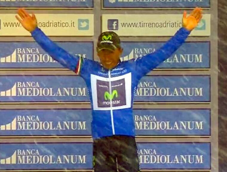 El colombiano Nairo Quintana (Movistar) ganó en solitario, bajo una intensa nevada, la quinta etapa de la Tirreno-Adriático y se puso líder de la prueba ciclista italiana con 39 segundos de ventaja sobre el holandés Bauke Mollema.