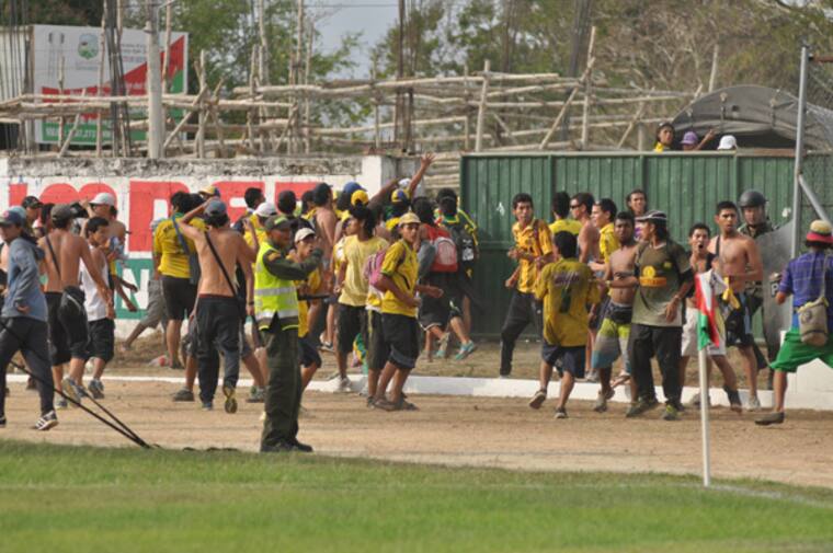 Por varios minutos los fanáticos de ambos equipos se enfrentaron a piedra y otros objetos contundentes, pero la policía logró controlar la situación en la parte interior del estadio, pero luego los sucreños salieron para reiniciar la trifulca.