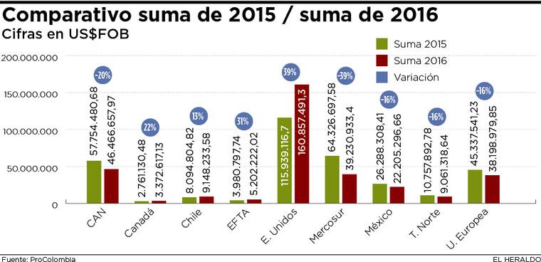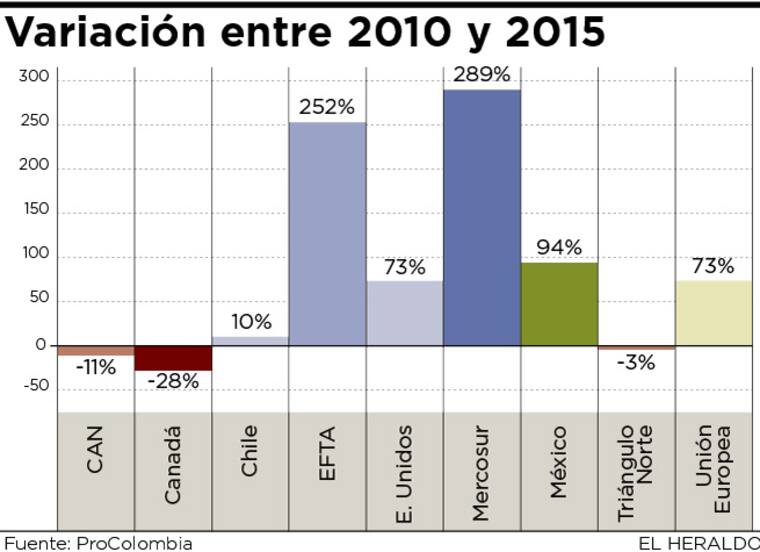 Al analizar las cifras de las exportaciones a mercados con acuerdo comercial, en los cinco primeros meses de este año, se evidencia que crecieron 3,2% con relación a igual periodo de 2015. Pasaron de USD403 millones a USD415,8 millones.