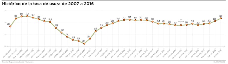 En el trimestre anterior (abril-junio de 2016) la tasa de usura estaba en 30,81%, mientras que entre julio y septiembre de 2015 fue 28,89%.