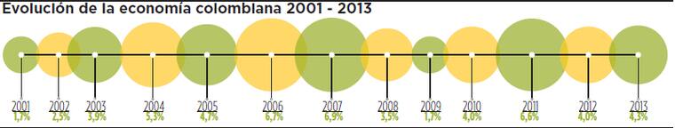 La economía colombiana creció 4,3% en 2013, según lo reveló el Dane, cifra que se ubicó por debajo de la meta fijada por el Gobierno para ese año del 4,5%, sin embargo superó los pronósticos de los analistas nacionales e internacionales que daban un crecimiento promedio del 4,1%.
