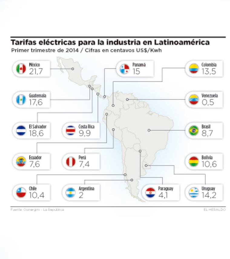 La tarifa por kilovatio nacional es muy superior a la de otros países latinoamericanos que no son tan competitivos en los mercados regional y global. Por ejemplo, los precios de la energía eléctrica para el sector industria para economías como las de Venezuela, Argentina, Paraguay y Perú son de USD 0,005, USD0,02, USD0,41 y USD0,74 por kilovatio (KWh), respectivamente.