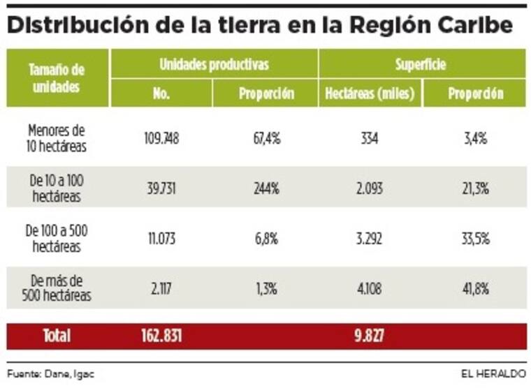 La concentración de tierras en la región es elevada: el 92% de las unidades productivas agrarias en el Caribe solo dispone, en promedio, de 2 hectáreas. Y el índice de Gini varía de entre 0,73 en Atlántico, el más urbano, hasta 0,83 en Córdoba, el departamento con mayor población rural de la región y, coincidencialmente, con peores indicadores de pobreza.