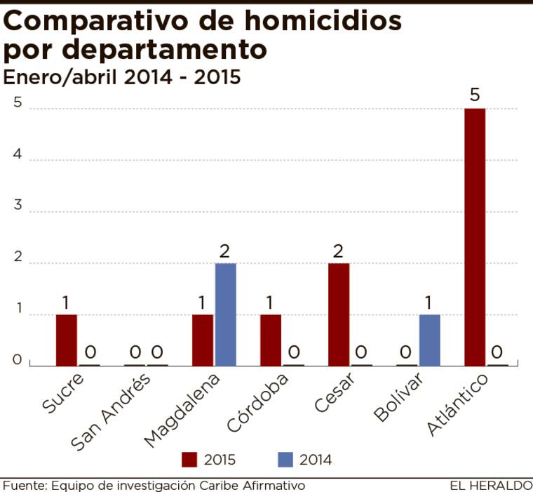 En el primer cuatrimestre de 2014 fueron asesinados tres miembros de la población LGBTI en la Región Caribe, mientras que en el mismo periodo de 2015 fueron 10, de acuerdo con la base de datos de la corporación Caribe Afirmativo.