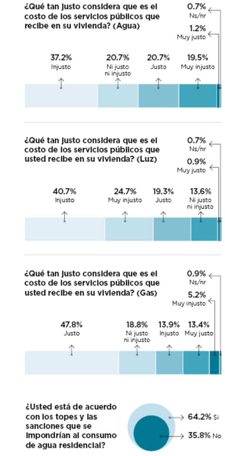 Sin embargo, el 37.2% catalogó como injusto el cobro del servicio público de acueducto, asociado al precio, así como el de energía eléctrica. Solo el servicio de gas domiciliario fue señalado como justo.