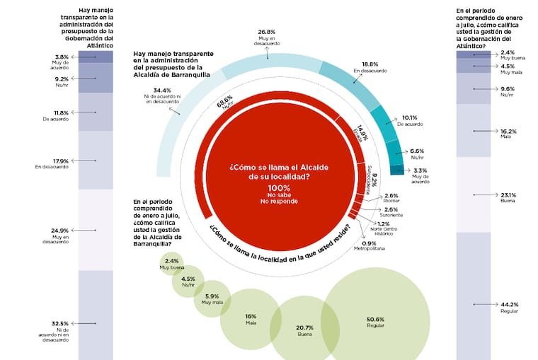 Otro de los temas revisados fue la efectividad de la gestión de las cinco entidades públicas más importantes del departamento, en las que todas fueron calificadas como regulares. La puntuación más alta para el calificativo señalado lo tuvo la Alcaldía distrital con un 50,6% y el menor fue para la Gobernación con un 35,4%. También hubo cuestionamientos sobre el manejo con transparencia del presupuesto distrital, en el que un 26,8% dijo estar 'muy en desacuerdo', con que estén siendo bien manejados los recursos.