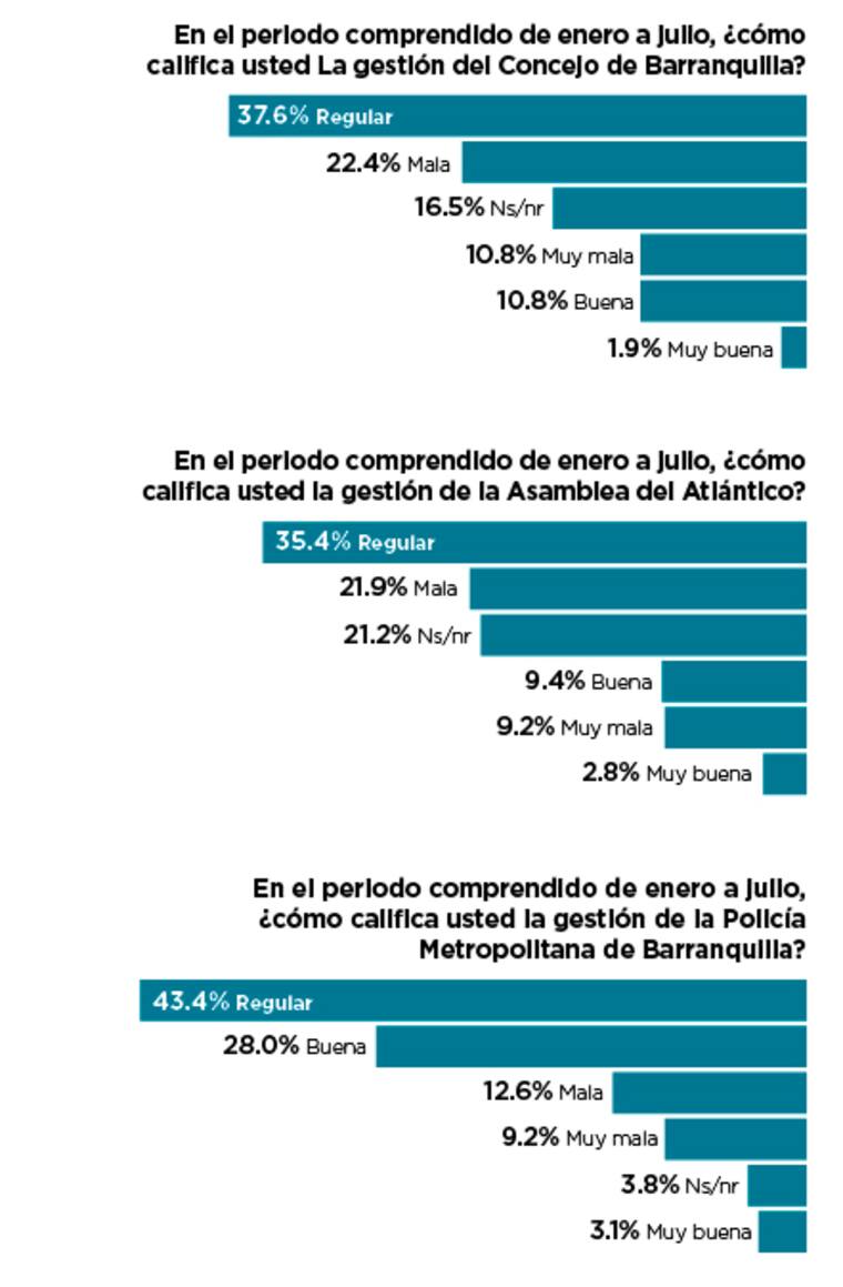 Tal evaluación se refleja en la ubicación de la inseguridad como el problema que más afecta a Barranquilla con un 44,9%, seguido por desempleo y movilidad. Siendo el primero responsabilidad de la Policía y el segundo y tercero de la Alcaldía.