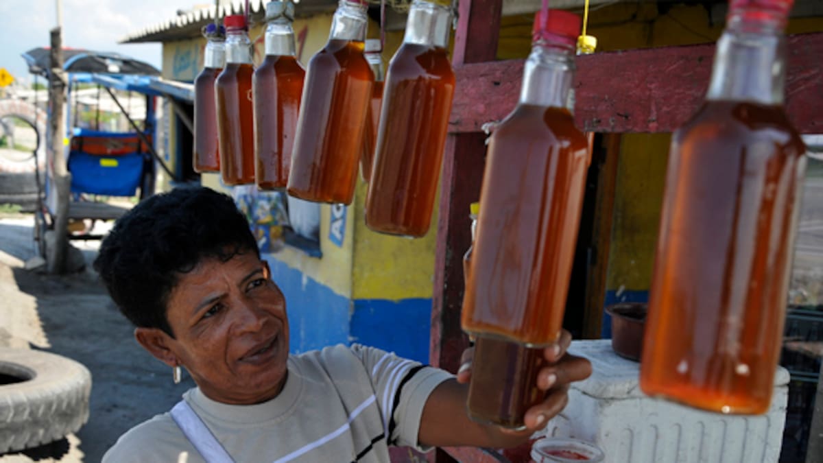 Para obtener los 300 mililitros de aceite que contiene cada botella, vendedores como Esmeralda Acosta ponen al fuego pedazos de hígado de tiburón con un poco de agua. El proceso dura dos días. 'Compro el hígado crudo, lo estrujo y lo pongo en el fogón. Le echo agua, espero que empiece a soltar el aceite y a medida que se seca lo voy sacando para que se asiente en una olla. Al día siguiente lo envaso', explica la mujer.