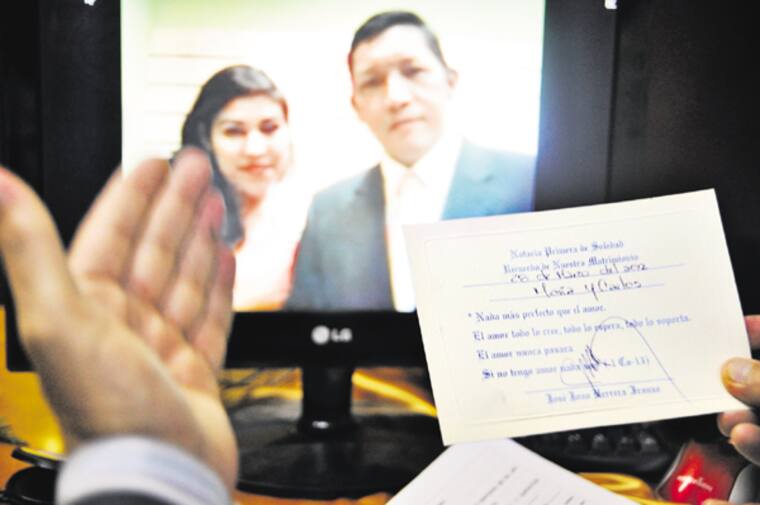La voz del Notario se alcanzó a escuchar en el recinto, mientras los novios escuchaban atentos. Mirándose a los ojos y tomados de la mano, asentían de una forma casi devocional a cada una de las palabras que Herrera les iba recitando. El Notario, revestido con su autoridad y como experto maestro de ceremonias los invitó a la lectura de los votos que ambos recitaron como breves poemas de amor y con una especie de fervor místico a pesar que el escenario donde convergían las partes no era más que un par de pantallas de computador. “Yo, María Elena Anaya Quiroz me entrego a ti, Carlos César Caballero Amador, como tu esposa y te recibo como mi esposo y prometo amarte en la alegría y en el dolor, en la pobreza y en la prosperidad…”, recitó sus votos la novia.