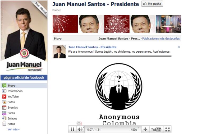 El grupo de ciberactivistas Anonymous ‘hackeó’ la página del presidente Juan Manuel Santos en Facebook y la cuenta en Twitter del expresidente Álvaro Uribe. En ambas ocasiones, el colectivo anónimo compartió un video relativo al Día de la Independencia