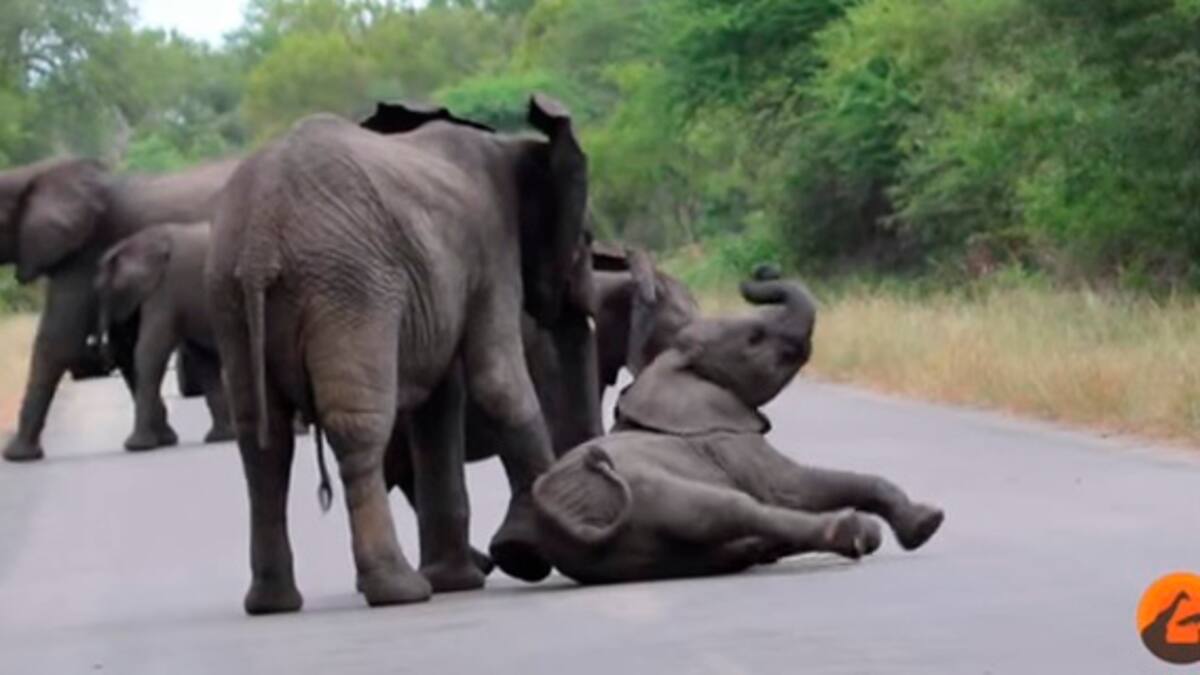 Una cría se desploma en mitad de una traficada carretera en el Parque Nacional Kruger en Sudáfrica, y el resto del grupo va en su rescate. Tras varios minutos de esfuerzo, finalmente logran ayudarlo a ponerse en pie y seguir su camino.