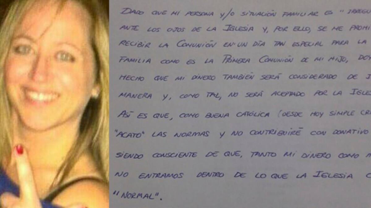 La mujer compartió dos imágenes. En una se lee un comunicado de la parroquia donde se advierte que no podrán tomar la comunión las 'parejas de hecho, divorciados y vueltos a casar civilmente'. En otra, la mujer responde a la Iglesia. 'Como buena católica […] acato las normas y no contribuiré con donativo alguno siendo consciente de que tanto mi dinero como mi persona no entramos dentro de lo que la iglesia considera normal', dice la carta de Conesa.