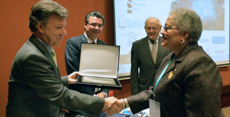 El subdirector de la OPS, José Teruel, le entregó al presidente Juan Manuel Santos el certificado de verificación del cumplimiento de los requisitos de eliminación de la oncocercosis en una ceremonia a la que también asistió el expresidente de EU Jimmy Carter, cuya fundación ha ayudado al combate de la enfermedad.