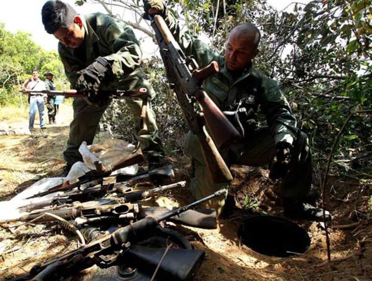 El titular de la Dijin, el general Carlos Ramiro Mena, precisó a Efe por teléfono que el arsenal de guerra estaba almacenado en siete escondites de la zona boscosa de Guacamayas y Santa Elena, parajes rurales de la localidad de Mapiripán, en el departamento del Meta.
