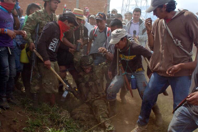 Los indígenas arrastraron uno a uno a los militares, que no soltaba su fusil. '¡Yo soy Colombia, de aquí no me mueven!', alcanzó a decir otro uniformado.