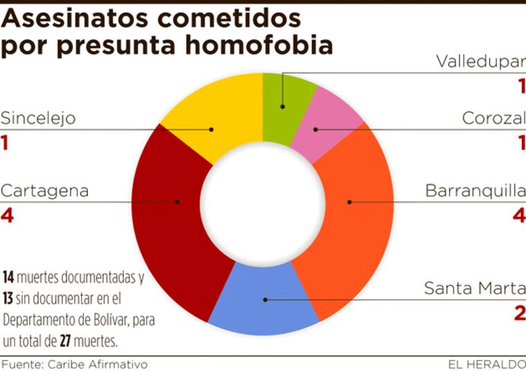 Un estudio elaborado por esta entidad señala que entre el 2007 y el año pasado, en las ciudades de Valledupar, Santa Marta, Barranquilla, Cartagena, Sincelejo, y Valledupar se registraron 14 muertes por presunta homofobia.