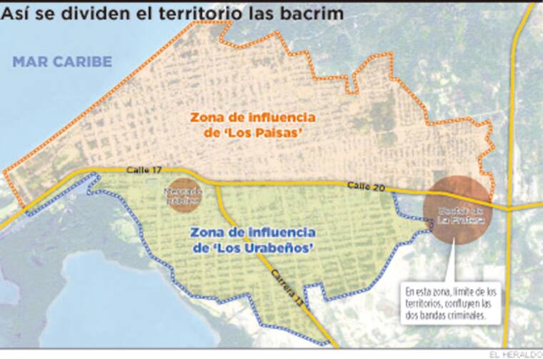 La escena de la extorsión se repite sin cesar a lo largo y ancho del pueblo. Lo único que cambia son los autores, según la ubicación del negocio. Es vox pópuli que el territorio está dividido por fronteras invisibles que controlan dos temibles bandas criminales (bacrim): Los Paisas y Los Urabeños.