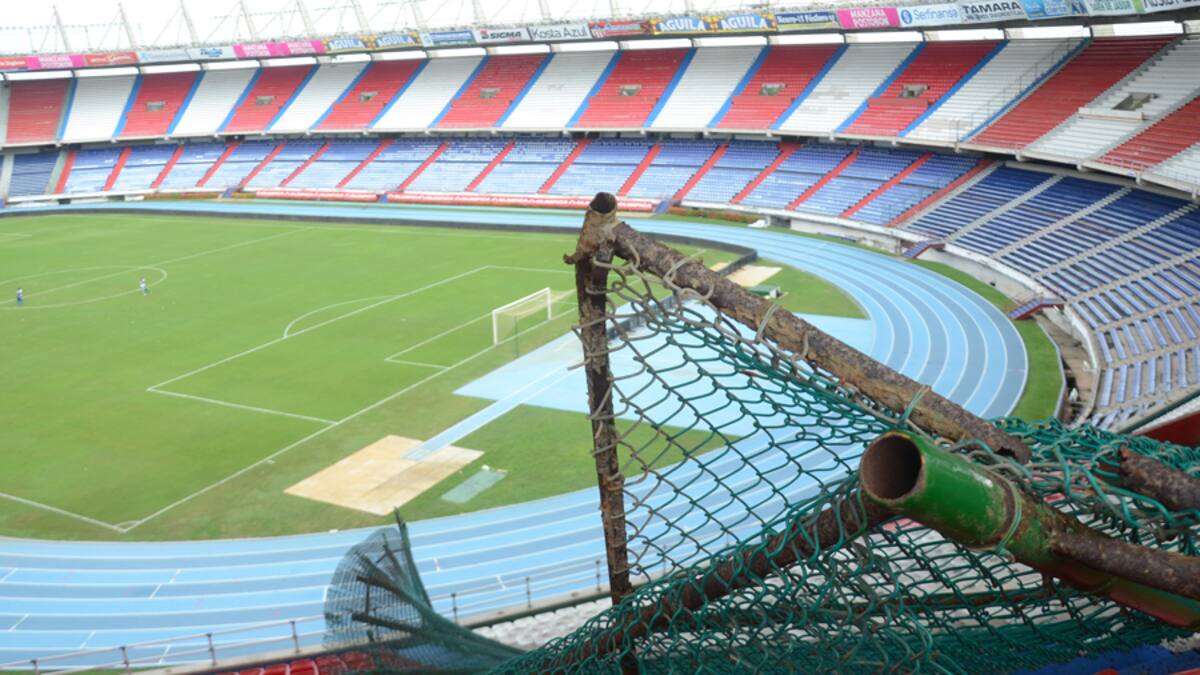Integrantes de las barras que se instalan sobre la tribuna Sur y Norte, en medio de enfrentamientos con la Policía, arrancaron 25 sillas y las lanzaron a la pista atlética con el fin de agredir a los uniformados. De igual forma, en la parte alta de la tribuna Sur destruyeron la malla que separa ese sector, con el de Occidental.