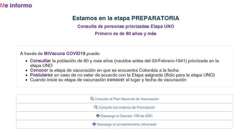 No obstante, por ahora, en el aplicativo, que arrancó su disponibilidad ayer cerca del mediodía, solo podrá ser consultado por los ciudadanos mayores de 80 años, quienes recibirán la información sobre en qué etapa serán vacunados.