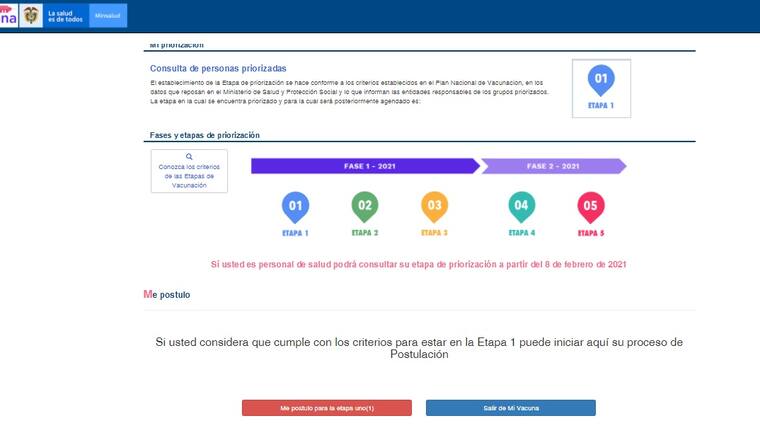 Un promedio de mil visitas por minuto tuvo este viernes, durante su primer día de funcionamiento, la plataforma virtual ‘Mi Vacuna’, en la que los colombianos podrán consultar la etapa, la fecha y el lugar en que serán vacunados contra la covid-19.
