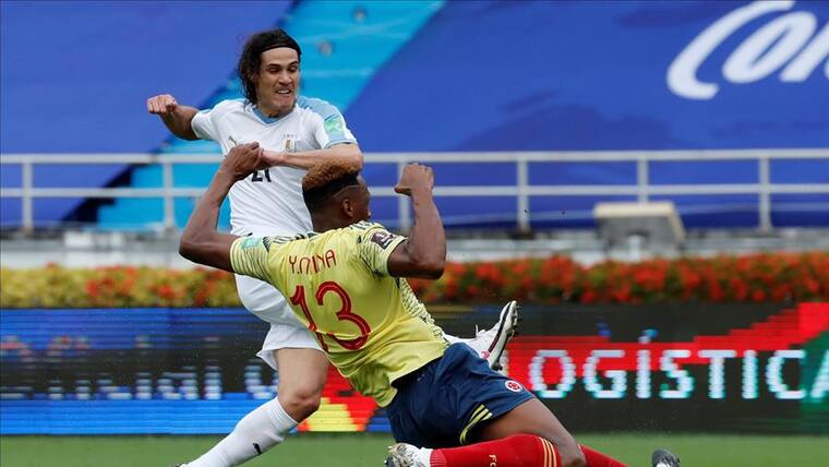 4. GOL de Uruguay. Yerry Mina y Jefferson Lerma se equivocan saliendo. La dejan suelta, Nahitan Nández se aviva y habilita a Édinson Cavani, quien no perdona y define abajo y al costado de la mano izquierda de David Ospina.
