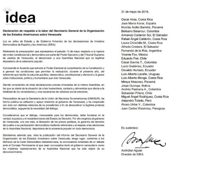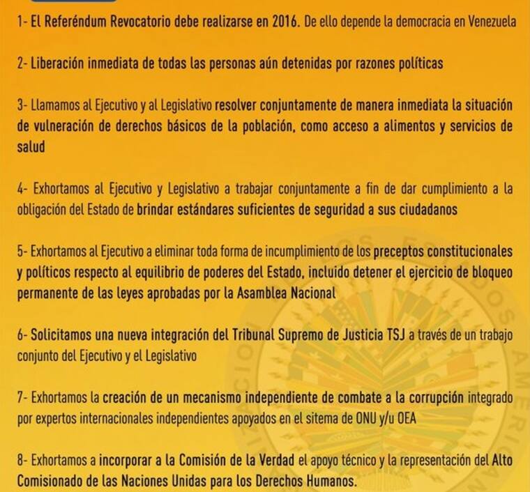 Añade que será el Consejo Permanente el que tendrá que tomar esa decisión, 'pero prácticamente todos los países coinciden en que en Venezuela se está produciendo una grave alteración política del orden constitucional por maniobras de tipo jurídico que alteran el orden democrático. Ilustrándolo con la negativa a la convocatoria del referendo mediante el cual se podría empezar a solucionar la crisis política', apunta.