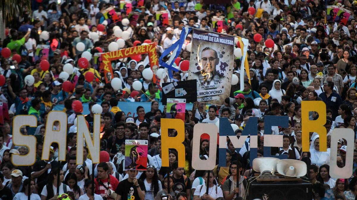 La procesión era encabezada por una imagen de Romero montada en un pequeño camión y tras de ella muchos jóvenes que portando carteles y fotos del asesinado arzobispo gritaban 'San Romero vive', mientras en el cielo estallaban petardos.