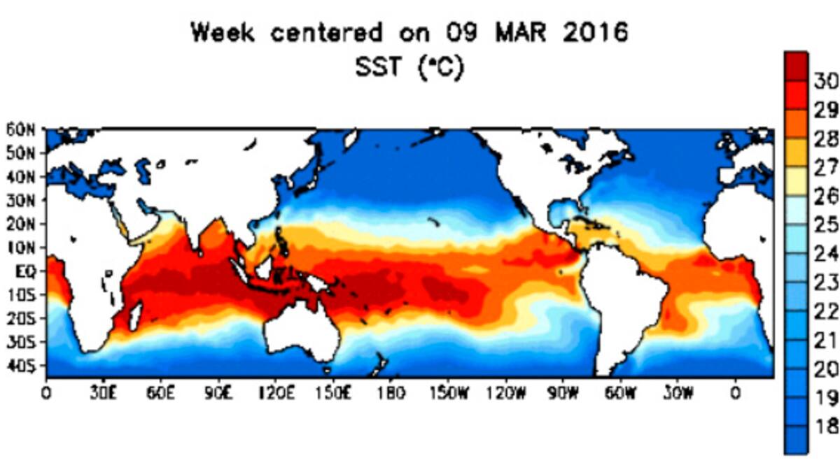 Animación de la temperatura superficial del mar desde el 23 de diciembre de 2015 hasta el 09 de marzo de 2016.