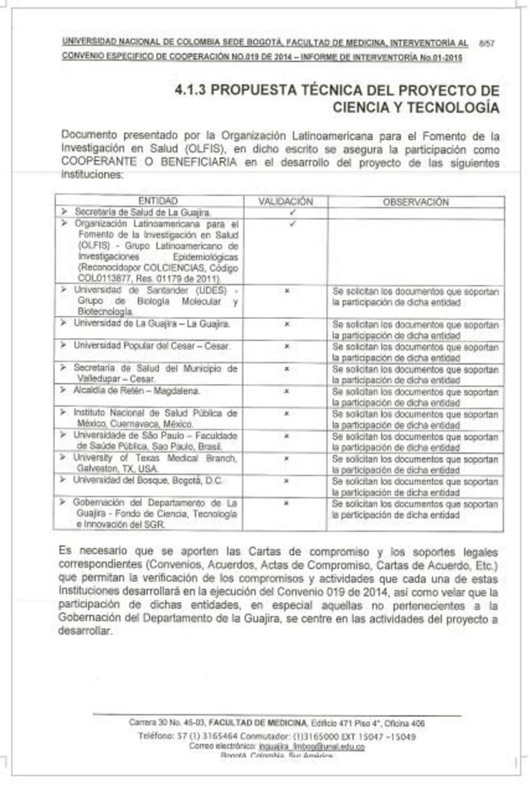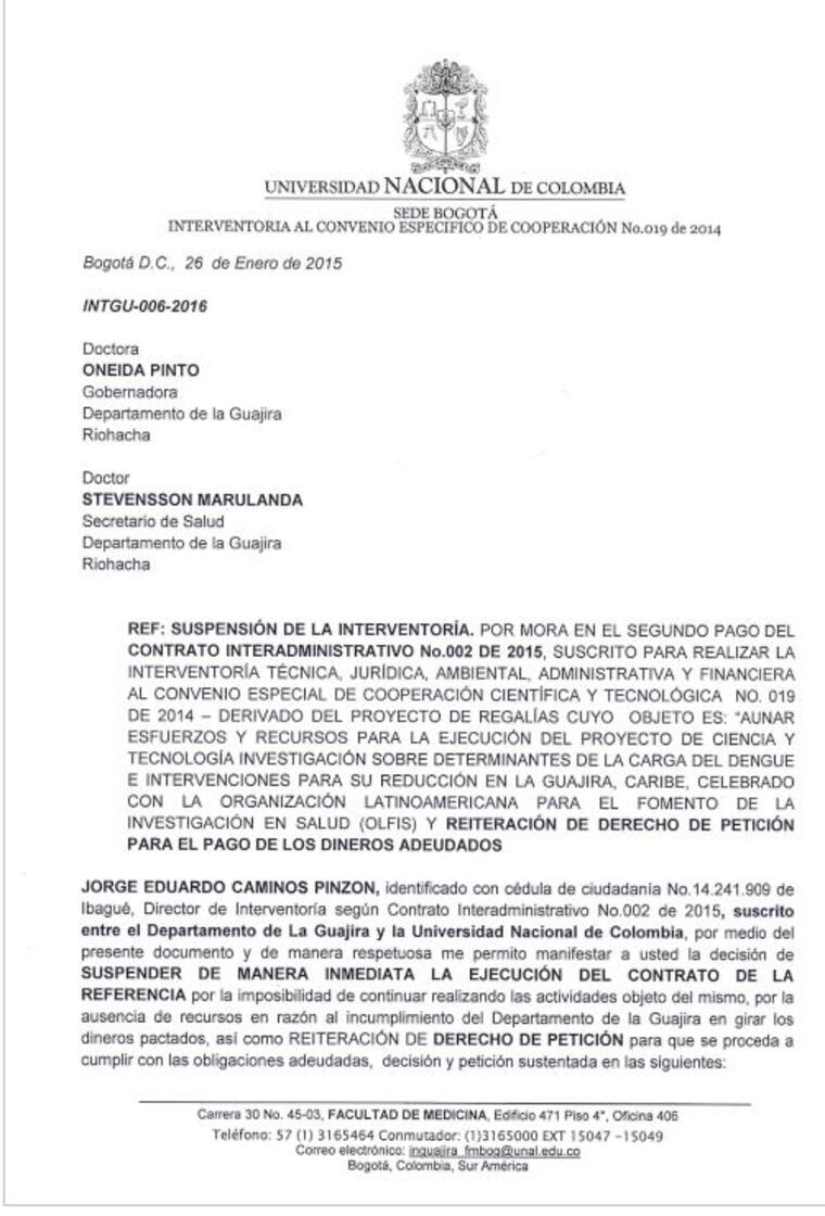 En una comunicación a la Contraloría, el 3 de marzo de 2016, la Universidad Nacional hizo una solicitud de acompañamiento e intervención al contrato para 'determinar así la posible comisión de hechos de responsabilidad fiscal por parte del anterior secretario de Salud de La Guajira, Gonzalo Araújo Daza, en su calidad de supervisor del convenio (…) y/o por parte de la entidad a su cargo o sus funcionarios y de Olfis, a través de su representante legal, Freddy Díaz Quijano, directamente o a través de funcionarios de esa entidad o de parte de terceros, por el manejo de esta última entidad de dineros de propiedad de la Nación, provenientes del SGR'.