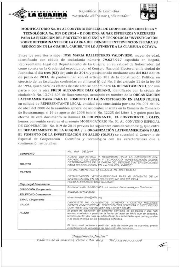 Igualmente, indicaron que sí se han realizado las actividades y que de acuerdo a estas se les han girado los recursos. 'Hemos realizado las encuestas, visitas a los hogares, instalado trampas, se ha realizado un curso taller sobre diagnóstico del dengue, se han entregado 13 de los 42 productos convenidos y se firmó un convenio con la Universidad de La Guajira para instalar un laboratorio con el fin de apoyar la investigación', explicaron los representantes de Olfis, quienes dijeron que han generado 60 empleos.