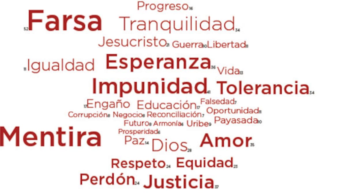 Mentira, farsa e impunidad, fueron las palabras que más utilizaron los lectores para describir el significado de la paz en Colombia. La primera tuvo 54 repeticiones, la segunda 52 y la tercera 41, respectivamente.