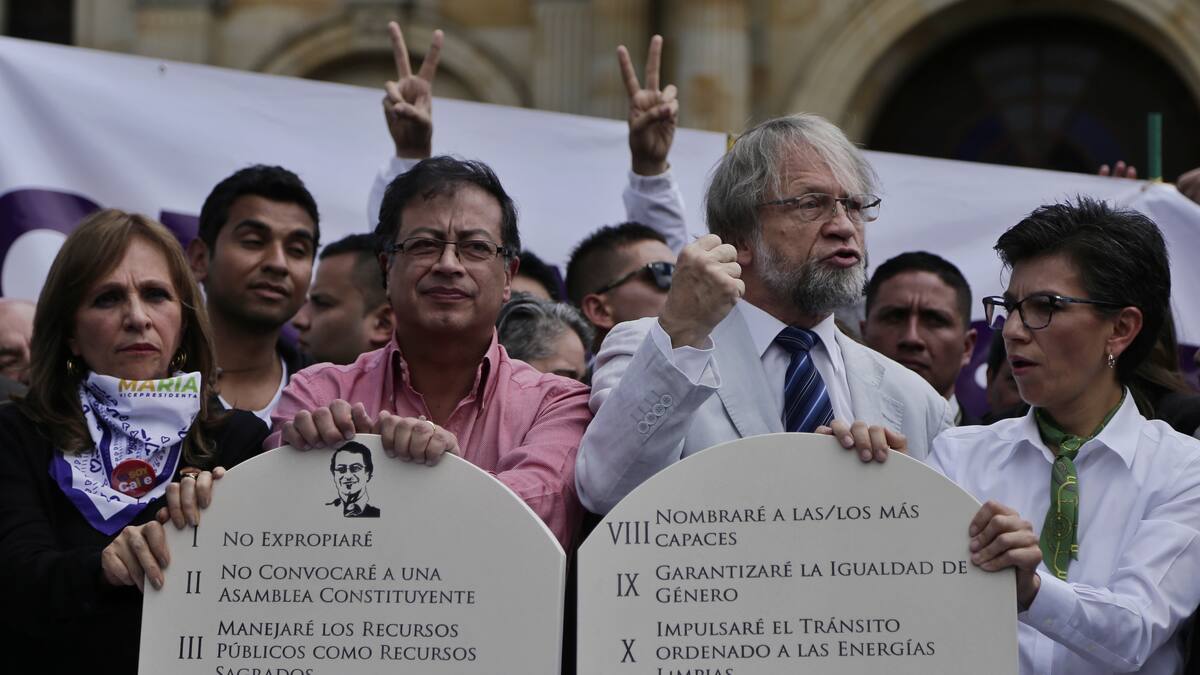 'Me comprometo a no expropiar; a no convocar una asamblea constituye y a defender a fondo la Constitución de 1991; manejar los recursos públicos como recursos sagrados y a mantener la disciplina fiscal. Ratifico mi compromiso de impulsar la iniciativa privada de millones de Colombianos, garantizar la democracia pluralista, el respeto a la diversidad y respetar el Estado social y de derecho', dijo Gustavo Petro, al aceptar los compromisos pedidos por López y Mockus.