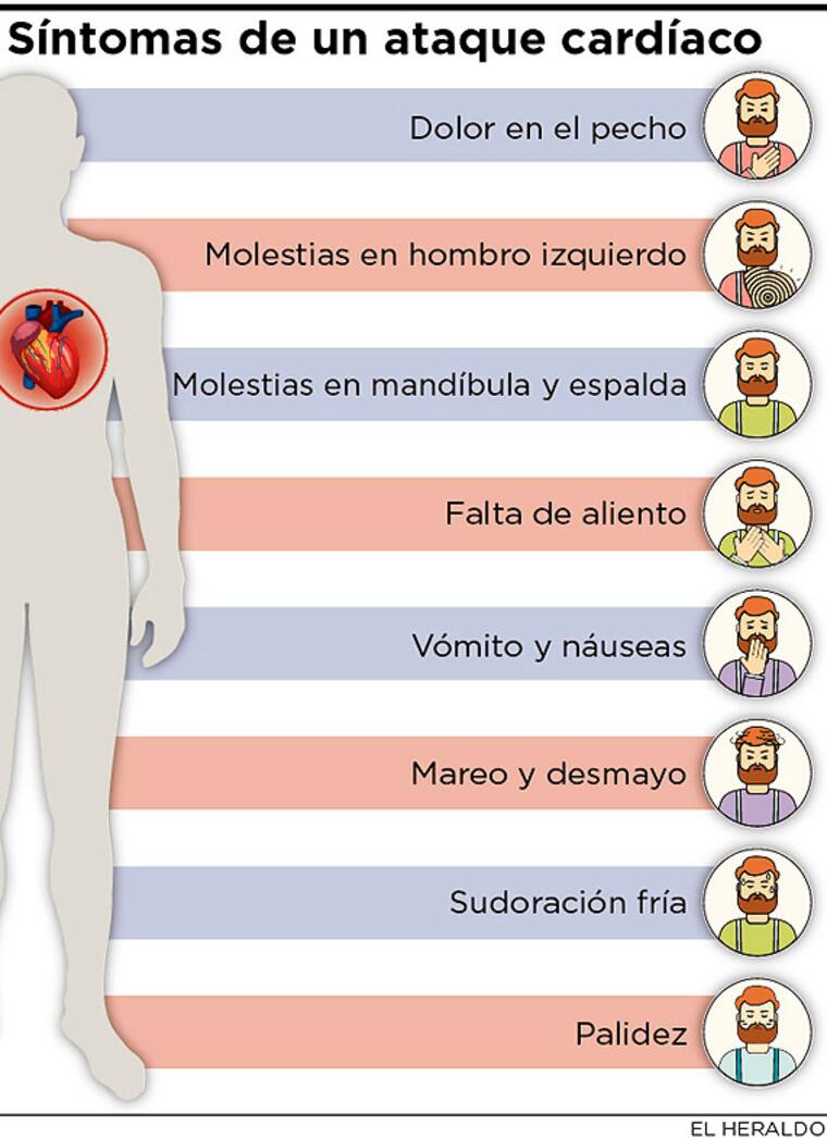 Tanto en hombres como en mujeres el malestar en el pecho debe ser un signo de preocupación. Aunque en ellas solo la mitad que sufre un infarto presenta esta dolencia. En general, la molestia se puede presentar en la parte superior del cuerpo: en un brazo o en ambos (generalmente cerca al hombro izquierdo), en la espalda, el cuello, la mandíbula o la parte superior del estómago.