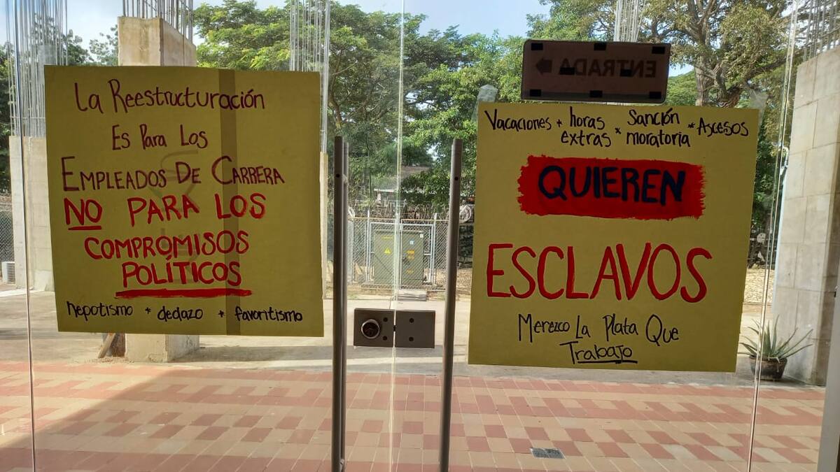 Los empleados pegaron carteleras con mensajes de rechazo en la sede de la Alcaldía y además radicaron un documento.