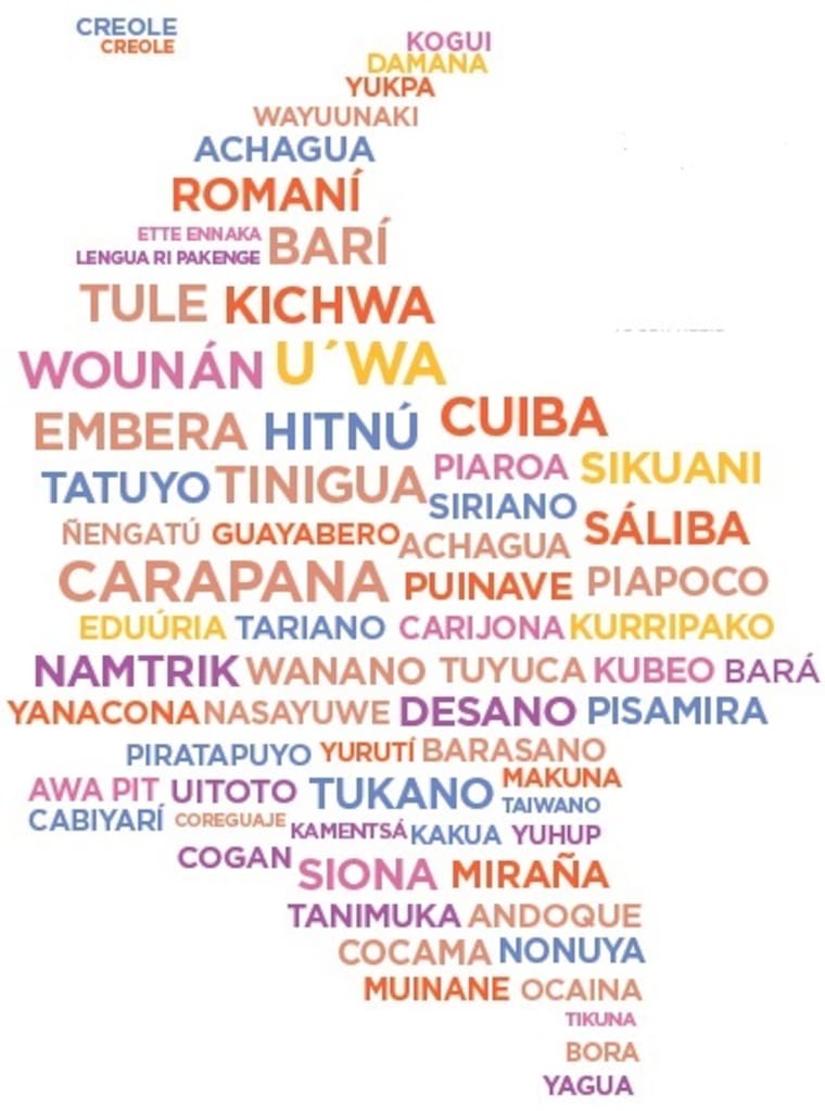 Este mapa contiene los nombres de las 65 lenguas indígenas, o indoamericanas que se hablan en el país. Según un estudio de la Universidad de los Andes y el Centro Colombiano de Estudios de la Lengua Aborígenes en Colombia, tres lenguas indígenas tienen más de 50 mil hablantes: Wayuu,Paez y Embera.