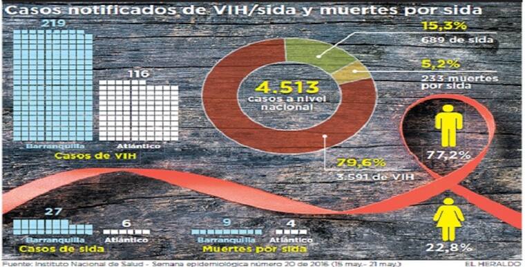 Según los últimos reportes del Boletín epidemiológicos del Instituto Nacional de Salud, en lo que va de 2016 se han notificado al Sivigila (Sistema Nacional de Vigilancia de Salud Pública) 4. 513 casos, el 79,6% –que son 3. 591– pertenecen a reportes de VIH positivo; el 15,3% de la cifra –689 casos– corresponde a pacientes en etapa de sida. En las cifras también figura un 5,2%, que son las 233 muertes por sida que se han dado en lo que va del año.