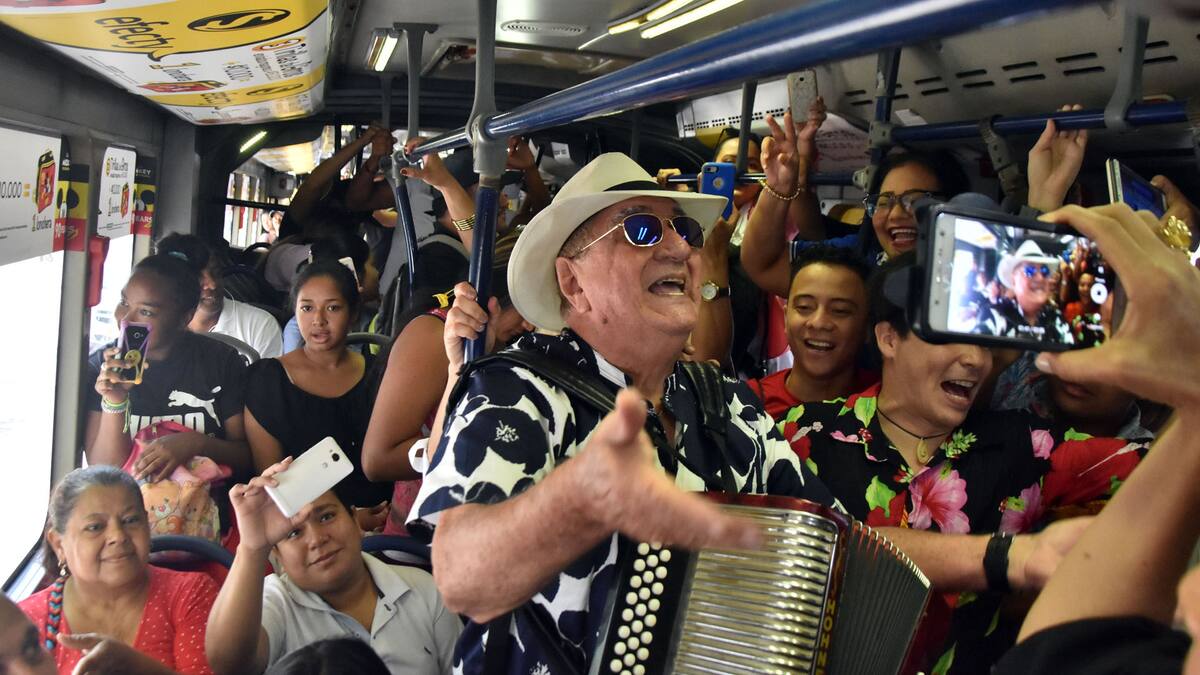 El maestro tocó los acordes de ‘Ron pa’ todo el mundo’, lo que convirtió el bus en una chiva de alegría. Algunos aún no podían creer que estaban apreciando un mini concierto en Transmetro. A un costado, un pasajero en una llamada decía con estupor: '¡Es Dolcey Gutierrez, está cantando en el bus!'.