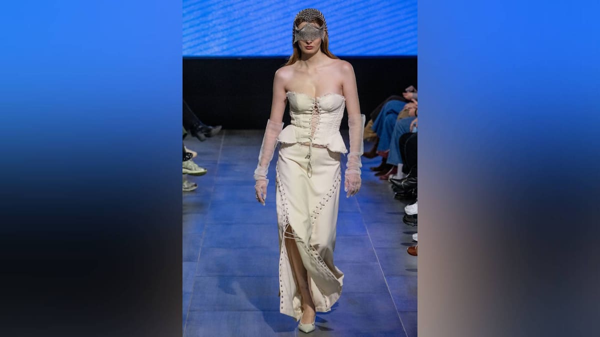 Para sus tres looks, la diseñadora colombiana ha trabajado principalmente con corsetería, cuerdas, velos y tejidos que evolucionan desde lo opaco hacia lo translúcido, reforzando visualmente la narrativa de transformación.