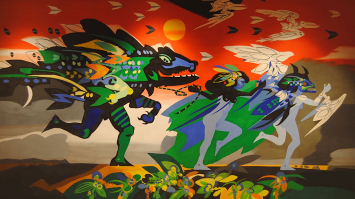 El telón de boca del Teatro Amira de la Rosa, una de las obras representativas de Alejandro Obregón, inspirada en la leyenda del hombre caimán y elaborada en 1982, fue restaurado exitosamente a finales de enero de 2020, informó el Banco de la República en un comunicado.