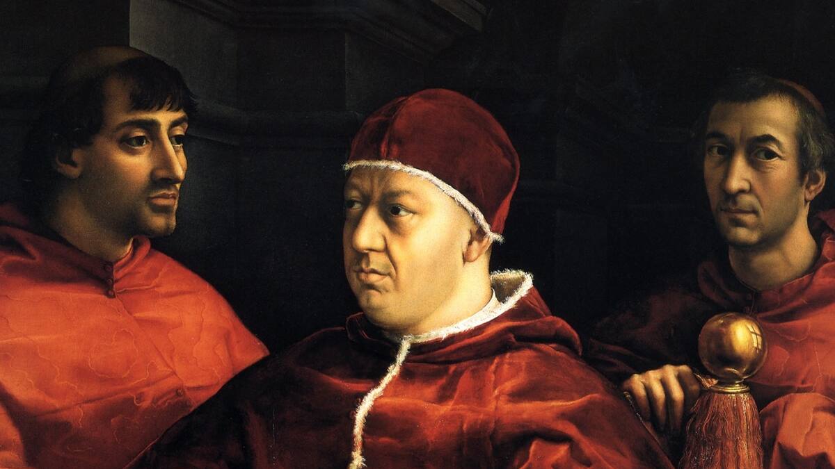 La pintura, datable en torno al 1518, es una de las más famosas del maestro de Urbino y muestra al pontífice León X sentado y acompañado a sus espaldas por los cardenales Giulio de Medici, a la postre Clemente VII, y Luigi de Rossi (a la derecha), ambos primos.