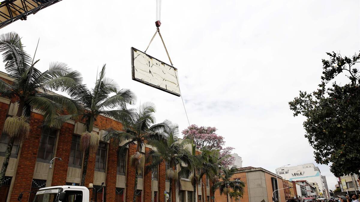 Un centenar de personas intervino en la delicada operación. Tela, cera y resinas fueron utilizadas para recubrir la obra monumental de 9 metros por 2,55 metros, que necesitó ser dividida en dos partes para facilitar su traslado desde el centro comercial New York Plaza hasta el Museo de Antioquia, donde fue elevada 24 metros por una grúa para ubicarla en su nuevo hogar.